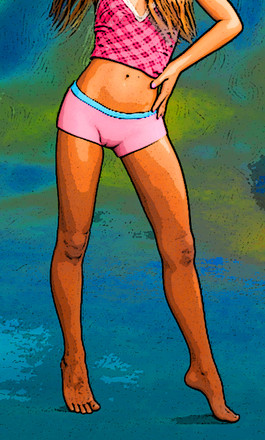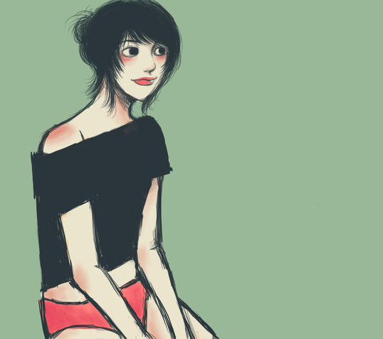 Alright. I actually like this a lot. But it seems you have some lines in places that are kind of awkward. The left knee has an extra type line in there that makes me confused. It goes in but then there's a bump coming out of it like her knee is just one big bubble or something. On the right thumb, there is one pixel on the bottom line of the wrinkle things that goes up and bothers me because she's young and shouldn't have such large wrinkles that go up and down but rather just small lines. And on the right wrist, that line shouldn't be there. Turn your arm to be like hers is. The little knobby thing is on the left side of the arm but we're seeing the right side so that looks a little strange to me.