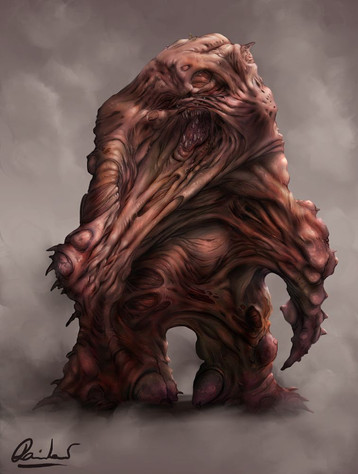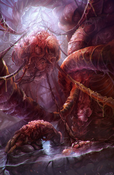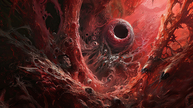The environment in which my creatures were suposed to live. 2 characters are walking to the core of this organic environment. Can you spot them ?Done using Painter.