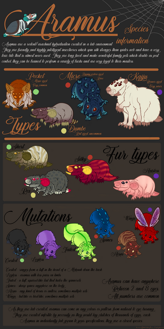 Dragon RatThis is NOT an open breed, but they are free (for your first two, only common or uncommon) then ten points after that (the only way to get a rare is through payed custom or adoption), if you would like one please comment here or note me with the form below. There is a limit of two per person, once there are enough out there I will start a stud book so people can track down possible breedings.Things To Know Dragon rats are carnivores and will eat anything from bugs the carrion of larger dead animals, the've even been know to eat mice and smaller normal rats.
