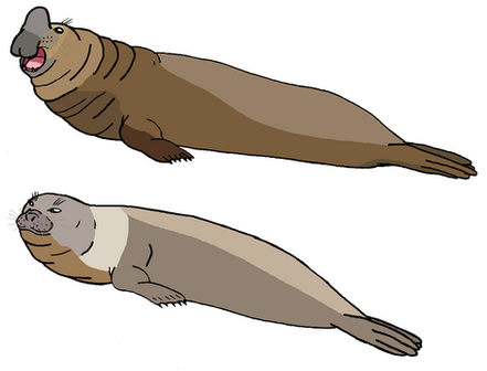 Description: The largest of all carnivorans, whom happened to be the largest pinnepid ever lived, and had the most sexually dimorphism, as their names come from their big noses for males. The elephant seal, was the only carnivoran that can exceed in sizes to small cetaceans, like dolphins(except for killer whales, whose not only the elephant seals' predator, but the largest members of the dolphin family. We know that there's 2 species of elephant seals, like the larger Southern(M.leonina) and the walrus-sized Northern(M.angustirosis) elephant seals. The northern elephant seal, and the walrus was rivaled by the southern elephant seal, for being the largest pinnepids. Most elephant seals lived in the beaches, in huge herds, where they lead by a beach master, whose a male. Males can fight each other for mates, and dominance, to control the harem herd. We do know the differences, that males had a proboscis nose, and they are muscular and had more blubber than females, while females don't have a proboscis, but they still had blubber as males do. Northern elephant seals are native to the beaches near Pacific Ocean, while southern elephant seals are native to Atlantic Ocean, but southern elephant seals lived ashore in Antarctica, southern beaches in South America, and southern Africa, southern Australia, and Tasmania. The predators of the elephant seals, are great white sharks, southern sleeper sharks, killer whales(aka orcas), when they are all ages. Pups of the elephant seals are fallen prey by leopard seals, and even sea lions. All elephant seals are much more bigger than polar and grizzly bears, by weight.