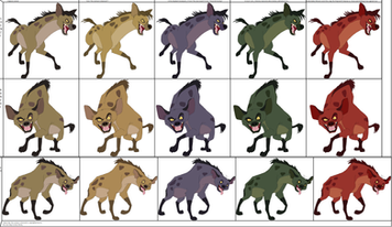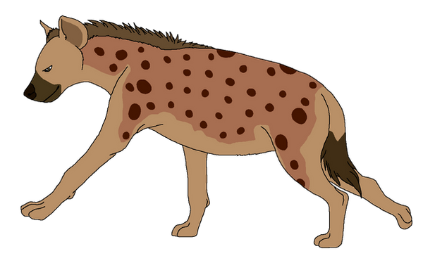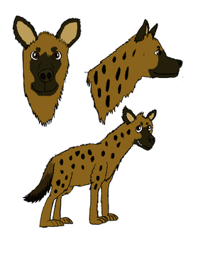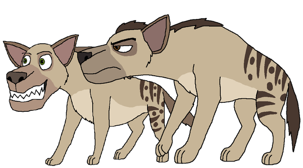 Description: The largest and the most famous known hyenas, lived on most parts of Africa(except for the deep jungles), as they loved to lived open dried grasslands, and even stoned up deserts. It is easily recognized as all hyenas looked like dogs, with short back legs, long arms, sloping backs from shoulder to tail-base, and slightly shorter snouts, but they are more closely related to cats than dogs. The most closest relatives to hyenas, are mongooses. It is easily distinguished from smaller hyenids, by their more grizzly bear-like built, big bellies, rounded hindquarters, round ears, and you know what else? Their fur coat is covered in polka-dot spots, which that spotted hyenas are the only members of the hyena family with spots. Their cries, are sounded like their laughter, which they are used for it when the hyena is under stress, or when they are excited. Spotted hyenas are Africa's 2nd largest carnivorous mammals ever known, after the lion, its archenemy. Rivaled against the jaguar, brown and grizzly bears, the spotted hyenas has the most strongest jaws in the animal kingdom, very strong the crack the rhino bones, than any other big cat, but not as stronger than that of great white sharks. Among primates(like chimps, gorillas, orang-e-tans, humans, etc.), tigers, black bears, dolphins, dogs(including border collies), and domestic pigs, they are among the most intelligent mammals, with cooperative problem-solving capabilities and complex social behavior with respect to group size. The society of the spotted hyenas are matriarchal, which means females are dominant to their packs, called "clans." Even low-ranking females dominate the highest ranking males of the clan, but they are dominated by the highest-ranking female. The baby hyenas are called, "cubs." In spotted hyenas, the cubs are not born blind, but they are born almost black, and had sharp teeth(similar to their adult counterparts), but unsure if they are born deaf? The cubs of their mother can fight each other to see who wants to drink their mom's milk. After months later, the cubs began to grow, and their black coat had been changed into their spots, to make their coat(besides their spots) more lighter, and earth-toned. All hyenas had dark faces and muzzles. But all spotted hyenas had varied in their coat colors, colored with sandy brown, ginger, graeyish brown, light graeyish brown, or yellowish graey. Undersides are lighter than their fur, and their tail-tufts are blacker as their spots(when they grew older, they remain even more blacker than their spots), but their manes are slightly redder than their base fur color. Their spots became brownish, and fades with age. Spotted hyenas are not only the ones that has spots, but they are the only hyenas that can hunt in packs, just like lions. They are also known for their strong animosity with lions, as 2 apex predators frequently clash each other over for food and territory, and often kill each other's cubs. Some people did make strong misconceptions, similar to coyotes(which they are actually very important parts of the ecosystem), that spotted hyenas are said to be hermaphroditic, ugly, dumb, cowardly, powerful, greedy, gluttonous, dangerous, stinky, scavenging dish-lickers. But in reality, spotted hyenas hunt more, than they scavenge, but lions steal their kill. That makes lions, are said to be scavengers. As these hyenas are popular, for example, they are featured as the minor or major characters who thinks those problems, and what they notice to the main characters, like the Laff'n Hyena from the cartoon, The Temperamental Lion(1939), the spotted/laughing hyena from the Disney cartoon of Goofy, Goofy in: African Diary(1945), this hyena from the animated movie, Walt Disney's Lady and the Tramp(1955), and the woozle-like hyena from the episode of Disney's New Adventures of Winnie the Pooh, "A Piglet Could Be King," for example. Also they have been featured as villains who worked with their masters(except for Jasiri and her family, from the TV series, The Lion Guard,(2015-present) which not all spotted hyenas are villains, like Janja, Chungu, Cheezi, Nne, and Tano. According to Kion, about Jasiri, some hyenas are good, which they among Jasiri, who respect the Circle of Life, by being scavengers, eating the leftovers of what lions left behind.), like Tom and Tab from the anime series, Kimba the White Lion(1950's-present), Joker and/or Harley Quinn's hyenas from the series of Batman(1960's to present. Even though The Batman TV series, depict these hyenas, who are happened to be albino and white) like Giggles, Bud and Lou, and the hyenas who used to work with Scar(aka Taka) from Disney's The Lion King(1994), like Shenzi(the female leader of the clan), Banzai(the male whose aggressive, and hungry, and crazy-eyed), and Ed(or Edume, or Edris for long. He's the male whose literally dumb, but he can use his laughter as communication, but according to Shenzi, when she, Banzai, and him trying to scheme about stealing an ostrich egg, he was said that he's a genius), inacurrately, the hyenas who lead by the male striped hyena(Tabaqui, Kurdi, or Fagan. But what I tell ya, FEMALES DOMINATE THE MALES!!! And about Tabaqui, he's still portrayed as a jackal. This series' spotted hyenas did looked like their striped counterparts.) who worked with the tiger Shere Khan, from the Mondo TV series, based on the Jungle Book: Shounen Mowgli and Simba the King Lion, Winner and the Golden Child, last but not least, Tabaqui(in this movie, he's portrayed as a jackal, but his species accurately referred as a hyena), whom he's the last of India's spotted hyenas(even the creator of this movie, misplaced spotted hyenas in India), who worked with Shere Khan the tiger, from the live-action Disney movie, the Jungle Book: Mowgli's Story(1998). They also used spotted hyenas as minor villains, like Messina in her hyena form, from the underrated movie Fred as F.R.O.7(1992), the hyenas(even though they looked like 