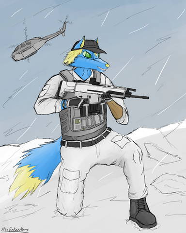 For the purpose of the contest, he was sent to Griffon City in a military exchange short before a violent change of government in the Daltic Union left him cut off from his country. Deciding he didn't want any part in the conflict, he chose to stay and eventually received residency. Since he had no other marketable skills, he applied to the GCPD, where he knew he could put his experience in urban warfare to good use. Dora Klendathu was assigned to take a look at him.