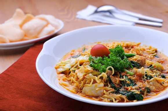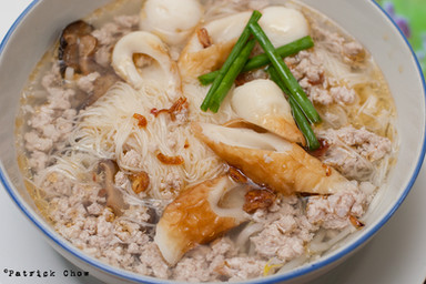 A common Malay breakfast food - rice vermicelli in a spicy gravy flavoured with tamarind.