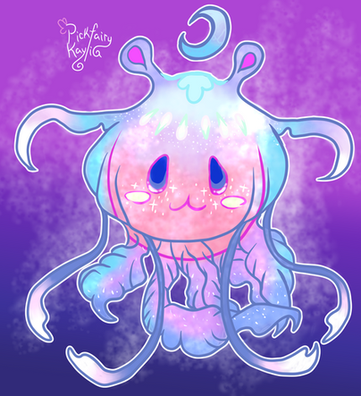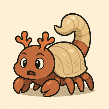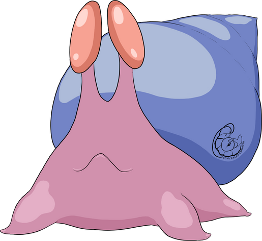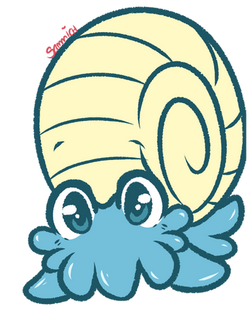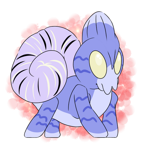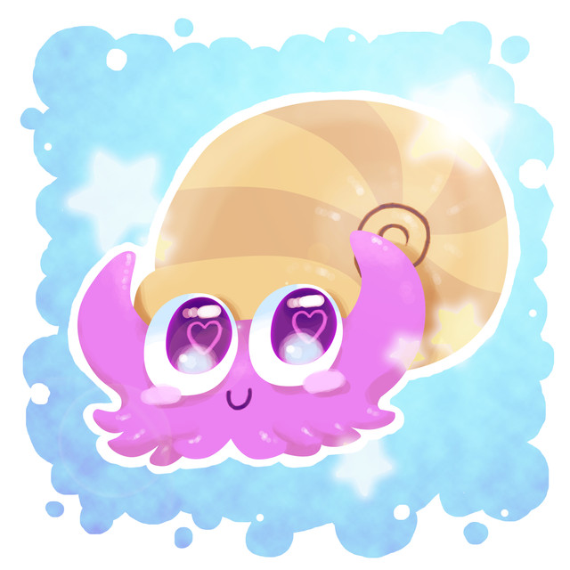 A cute little octopus looking critter that is tan, has two wispy antenna, and has a peach colored striped shell on it's back.