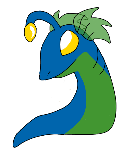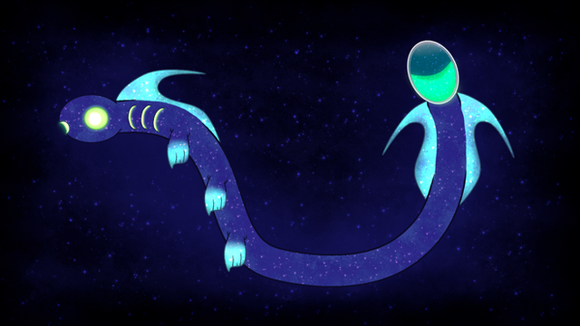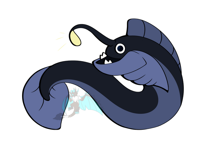 A large fish with a shrimp like tail, and a glowing bobble attached to it's forehead. This particular one is blue with a rainbow colored tail.
