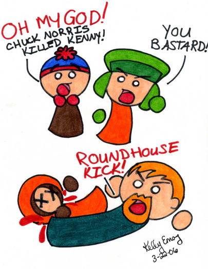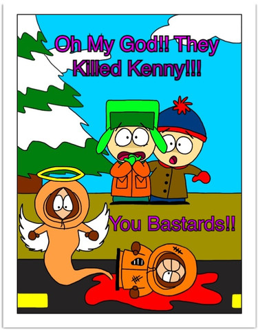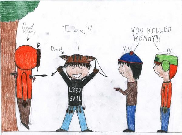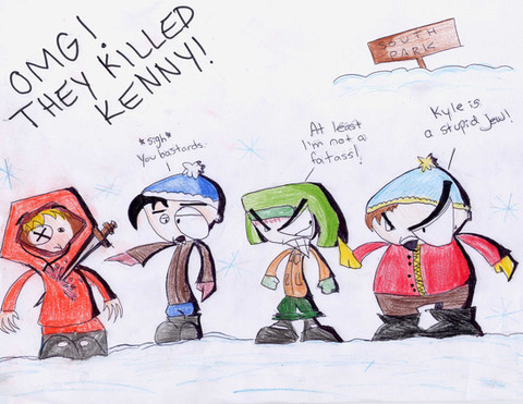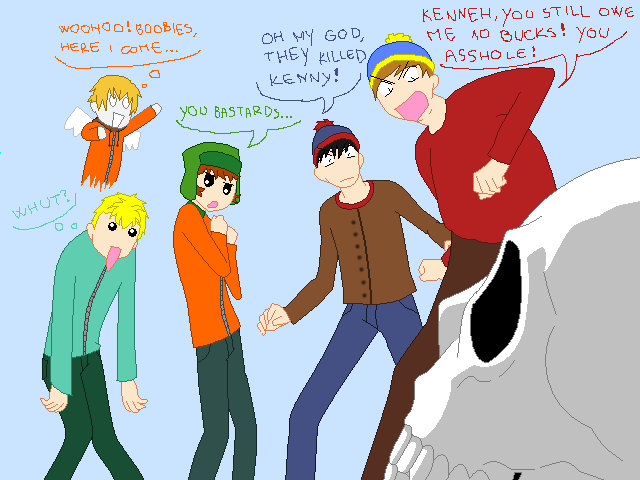 Well....due too complete boredom and dullness of my life.....I drew Kenny and he's comitting suicide.....poor Ken....couldn't take it anymore.........Cartman.....is laughing his ass off at Kenny's poor condition...........Stan and Kyle.....well just look at they're faces.........Stan,Kyle,Cartman and Kenny (c) South Park