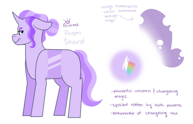 Mirage is mysterious and flirtatious. Unlike her mother, her unicorn magic is very powerful, but she doesn't like to draw attention to her talent. Β In face, Mirage prefers to be in the shadow, never seeking to become the center of attention. Β A mix of powerful unicorn and changeling magic grants her extremely unique appearance and capabilities. Mirage can not only take on the appearance of other ponies, but can also disappear and reappear at will.