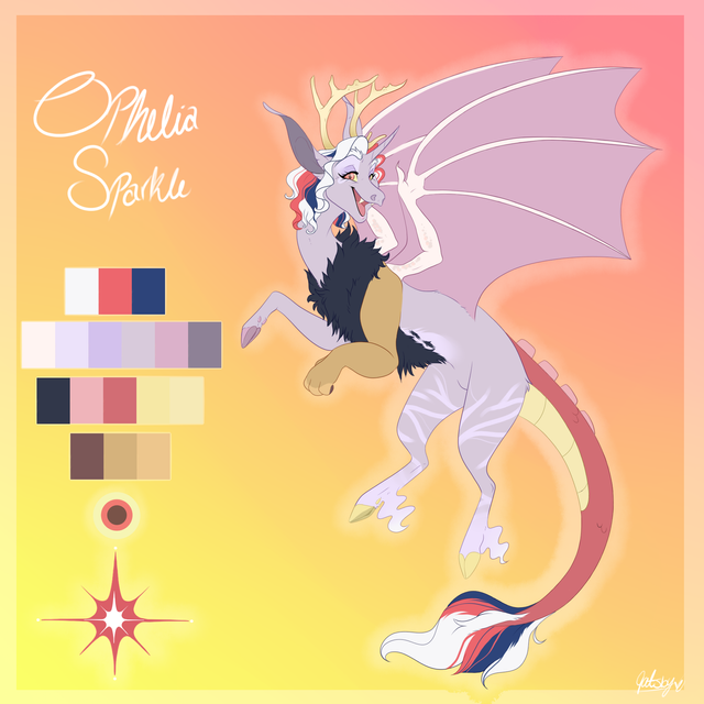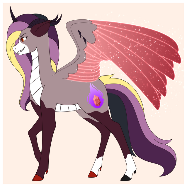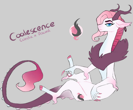 Having grown up in Canterlot Castle and experiencing the life of a royal, Harmony has grown to be quite materialistic. Her mother, Twilight, sent her away at a young age to study among other gifted ponies at Celestia's School for Gifted Unicorns. However, her magic was too unique and powerful for her to learn much through traditional studies, and the havoc she wreaked caused other fillies and colts to steer clear of her. Celestia, who had pity on the young Dragonequus, consulted her sister, Luna, who had experience with raising and teaching the art of chaos magic due to a child of her own. Luna was ecstatic to take her in, and Harmony soon considered both of the sisters as aunts.