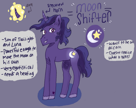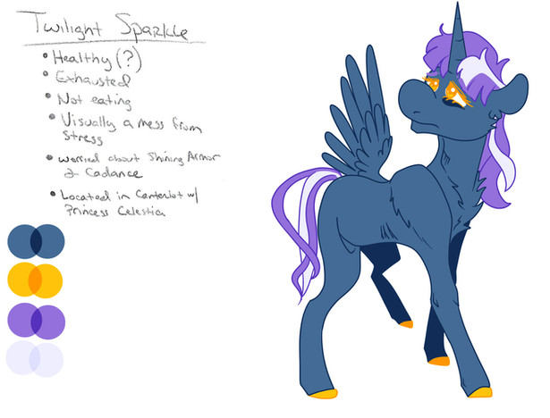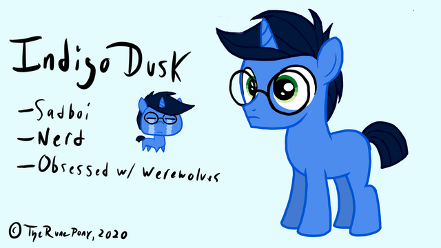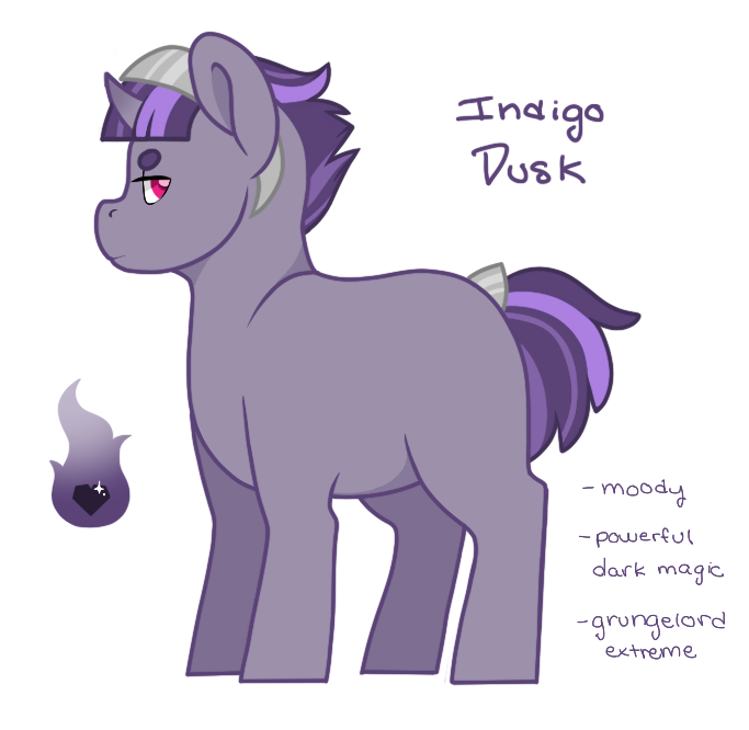 Indigo Dusk hates almost everything. Due to the constant pressure thrust upon him to eclipse his parents as rulers of equestria, Indigo rarely sees the light of day- he is nearly always confined in the library or amongst the guards, training to take his place amongst the royals. Because he is almost always out of sight, he has lots of trouble at social events. Due to embarrassment from one particular scenario, Indigo rarely opens his mouth to speak and usually communicates through emotive facial expressions, usually a scowl. In reality, Indigo is quite lonely and wishes he knew how to make friends.