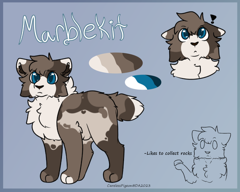 As the only boy in a family of girls (and a nonbinary parent <3), Marblekit feels he is the "protector" of the group, but unforunately he is a Certified Dumbass and often gets himself in more trouble than he prevents. He's incredibly clumsy, not very coordinated, and stupid as hell, but he has a heart of gold and loves his sisters with all his heart.