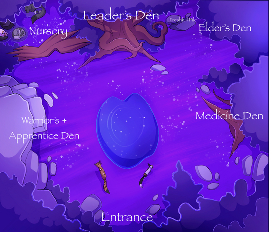 The arrow is where the camp entrance is, or you can access it through the waterfall where RainClan's old camp was.There's a second "floor" for dens.