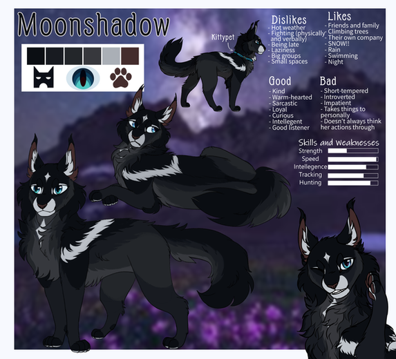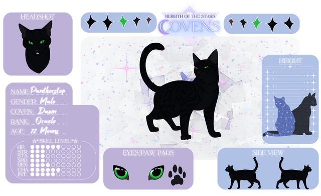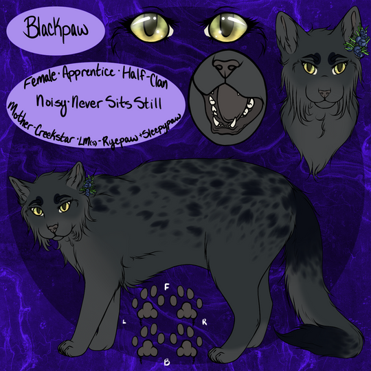 Moonstar is quiet, stealthy, and kind. She often blends so well into the shadows that other cats forget she's there. She's nervous and tries her best to make sure everyone gets along. Loves her sister Blackbird and brothers Fruitbat and Gracklesight more than anything. Absolutely head-over-heels for Nightpool, and wears a jewel he gave her around her neck.