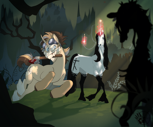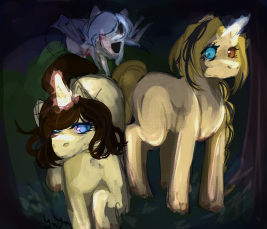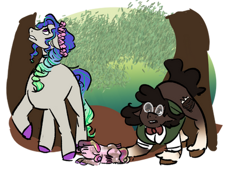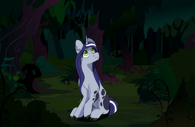 So, her story is kind of similar??? She was a normal Unicorn, born during a not-so-good time. So, in order to at least TRY and save Dewey, her parents sent her through some sort of transportation service in secret when she was just a toddler. But THIS time, when Dewey Crystal escapes, she's completely by herself. She's stuck in a swamp in the middle of nowhere, alone, for decades. She doesn't meet a single other pony growing up, so whenever she sees or finds another creature she's unfamiliar with, she becomes terrified and hides away. She probably got her cutie mark by doing something that helped her survive. Like.. maybe she found out how to filter the muddy swamp water with her magic so she could have clean water to drink and that's how she got her cutie mark? idk, that's still up in the air.