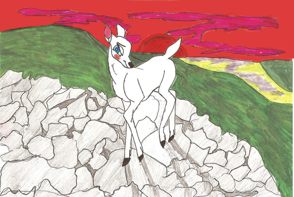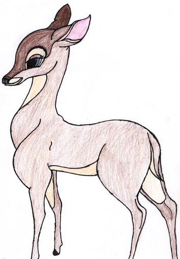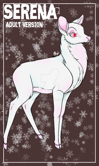 Minha OC para Bambi, apesar de ser albina foi dificil cria-la tentando achar algo inédito, no fim me decidi pelo marcador na orelha e os olhos completamente vermelhos e rosa e cílios brancos alem do fato de ter mais pêlo que o normal para um veado femea, sendo mais parecida com um veado macho. Minha referência para ela foi minha leoa Neona.