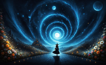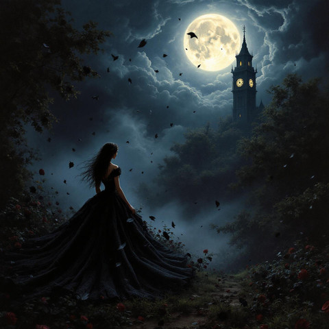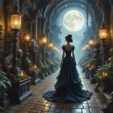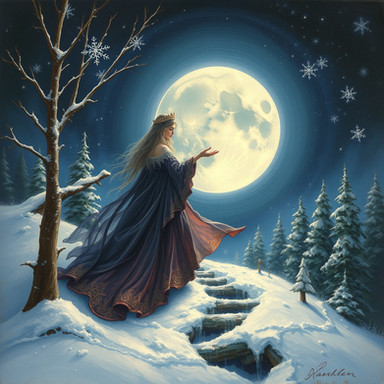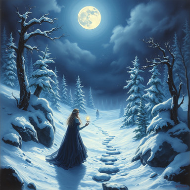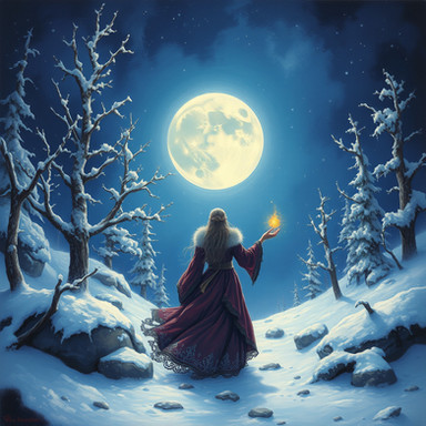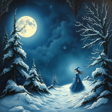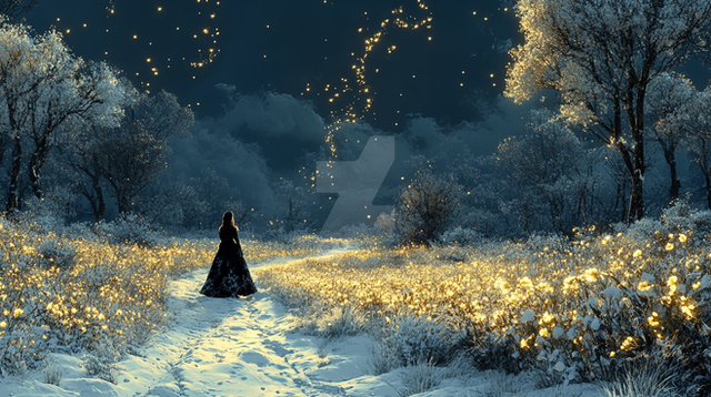 #beauty #magic #digitalart #fantasyart #ai #blackdress #lanterns #moon #night #snow #surreal #trees #winter #aiart #stablediffusion