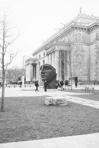 In the foreground isΒ Larry Kirkland'sΒ East 2 West Source Point, installed outside a city municipal building on Colfax Ave., Denver, Colorado.Kodak Tri-X semi-stand developed in Caffenol CL.