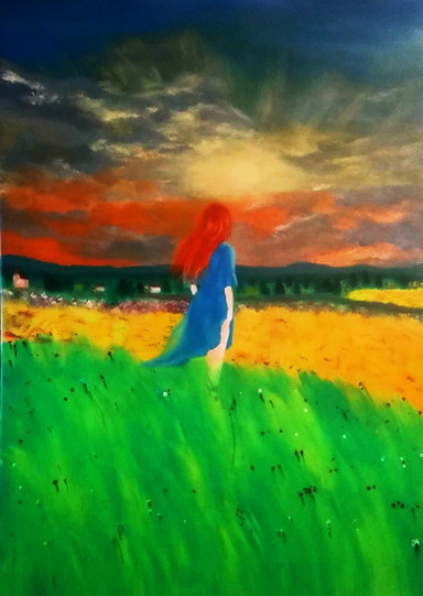 As I'm self-taught, a lot of my paintings' original intentions were to practice different techniques. Anya started as a sunset where I'd follow the light source in rays cast along the grasses. rather than a simple universal light that chooses a direction and gets darker, the farther away you go.