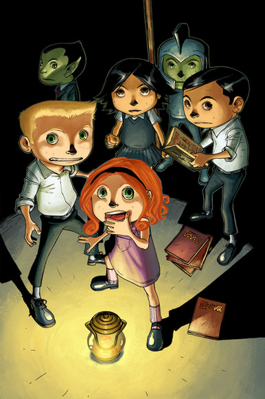 such a funny, pleasing illustration. I love the look on all their faces, I'd love to know what that Batman poster on the window says.