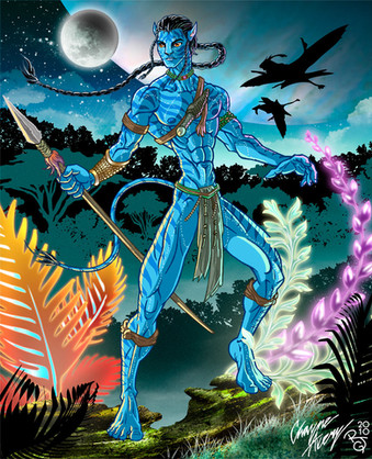 Hello, my name is Alexa. I am very happy to have came across you amazing artwork. The best thing about the artwork is the great dynamic action you have captured here. It is almost as if Jake leaps off the page and you can cut your finger with the spear. That 4th wall, z-plane (you know, x plane, y plane, z plane perspective dimension stuff) really packs a punch here. I love it. The lighting was also executed very nicely along Jake's body. The originality of the shape of Jake's appendages (lanky but stylistically curved) also wins major points for you with originality. The lost star for this category is because the jungle appears generic admist the amazing flora/fauna of Pandora.