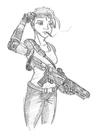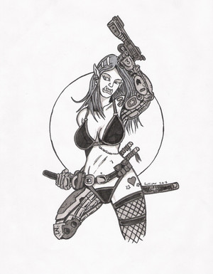 I drew this shadowrun character awhile back, when I was more into line-work. I think it was inspired by that weird Tarantino movie with the gal that had a gun for a peg leg.Related content
