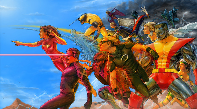whoo...do I love this piece. It's like the new timeline X1 movie, right? Colossus is maybe the newest member, Angel went through his first metamorphosis (i.e. UXM 379). Beast never left, and works as a human-mutant liaison, Kitty and Bobby are just getting their uniforms, and Elf is exploring his individuality, after ten or so years on the team. I LOVE THIS PIECE!