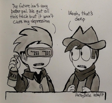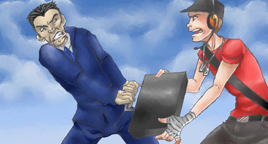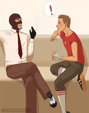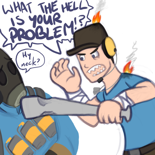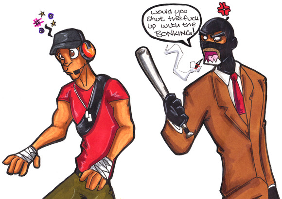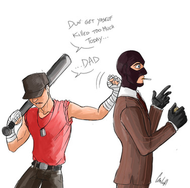 I was pressing the random button in a prompt blog constantly in boredom and got this , so I was like, "Scout would totally say that to Spy."Also, reference to Expiration Date, but I didn't have a reference to the actual scene, so the glasses look kinda weird I guess.