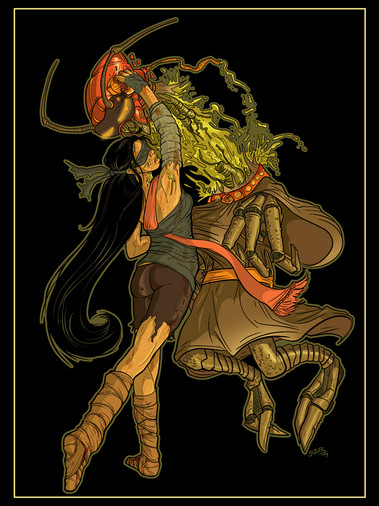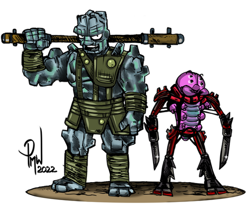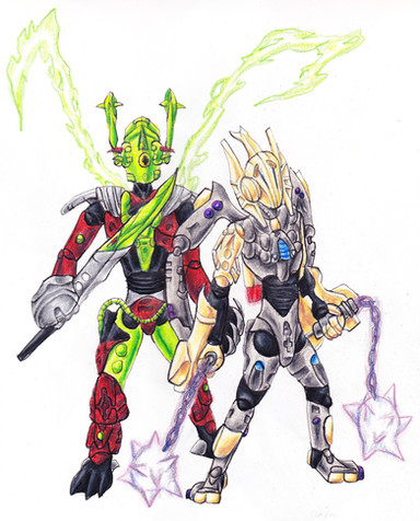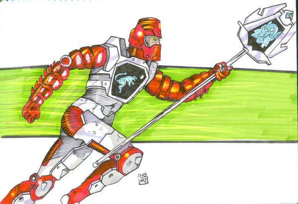 Here's the color version of the Micronauts pin-up I did for Dan Frazier, an amazing dude who travels to comic conventions all over the country and has one of the most spellbinding collections of original comic art I've ever seen. Dan has art from everyone, and when I say everyone, I MEAN EV-ER-Y-ONE! From the classics of the silver age to the latest and greatest, Dan has it all, including many from my hero, George Perez, who is good friends with Dan and is working to get this collection made into a book to benefit Heroes Initiative, a non-profit organization that raises money for artists without healthcare. Very cool stuff.I've done many drawings for Dan over the years, and since I know Dan has a fondness for 70's/early 80's characters, I decided to whip out two of my faves from one of my best loved comics, THE MICRONAUTS, with awesome art by Michael Golden. Bug and Acroyear were always my faves, and I hope I've done them justice. I also decided to go old school with this as well, so this entire page was inked with brush and ink except for the pole of Bug's rocket lance and Acroyear's sword blade. Phew, good workout for my brushes and steady hand.