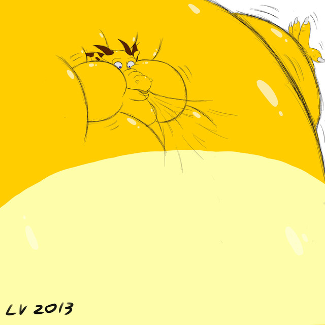 Commission art by www.furaffinity.net/user/jon/After attempting to fight back against the slime, the Pink Rathian ended up so completely filled up that she was at her absolute limit and completely immobile as the slime continued to fill her. All she could do at this point was wait for the inevitable explosion.