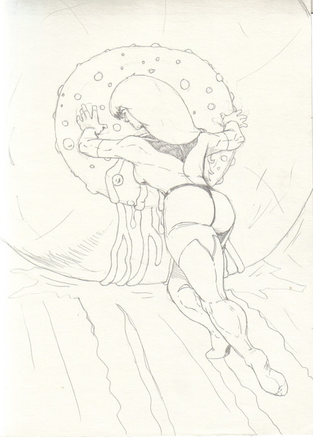 Love the concept of this piece... a space girl being consumed by some alien snail on a planet far far away, with her ray gun is just out of reach and getting further away by the second.