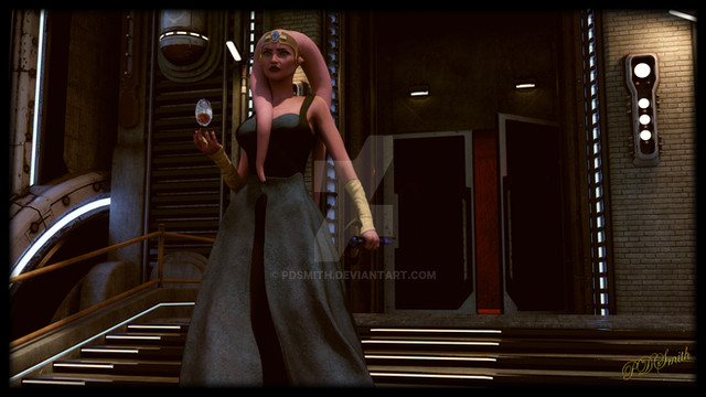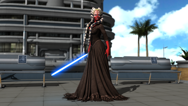 She looks like the sort of woman that everyone stops and notices when she enters a room... and they aren't certain whether they want or don't want her to approach them lol. I'm looking forward to learning more about her. I hope you are going for a mysterious look with this render, because you nailed it. The white and formal dress says purity and innocence. Given the 'wedding dress' look to it and there being a ring on her left ring finger tells me that she might be married. Her body language with holding the lightsaber says to me that she's to be taken very seriously, perhaps already on the defensive. Her facial expression looks mischievous and fun. There's a lot to be read in to, but farΒ more questions are raised than answered.