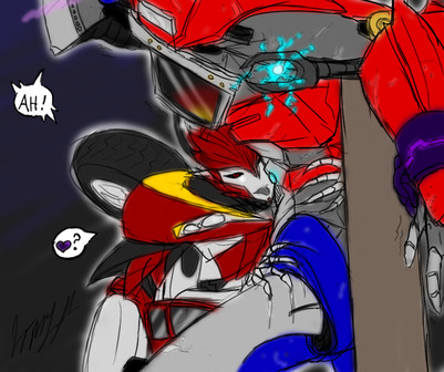 Optimus Prime... in stasis cuffs and Knockout's Electric prod being used as a 'spreader bar'. >3Welp...I'm going to hell! Who's with me? XD