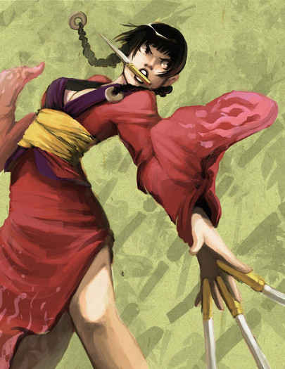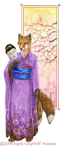 I found this looking for a reference picture of a kitsune. She's gorgeous! I love the colours in her kimono and her stare