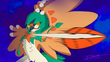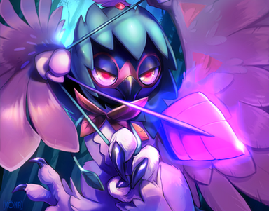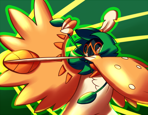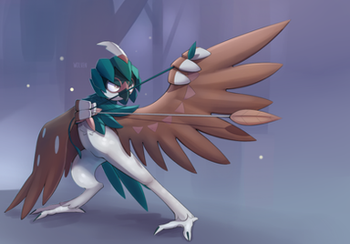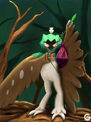 Here's a rushed drawing with a rushed background of a Decidueye with a totally not original pose!I really like the design of this pokemon, especially the hood.