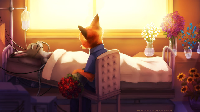 Seriously, why do people draw or write something about Nick being in either this recovery room, or in a coma? He's always the victim of everything, and they defend this bitch as if she is too innocent to hurt. This long ear bitch is an asshole towards Nick because of authors or drawers.