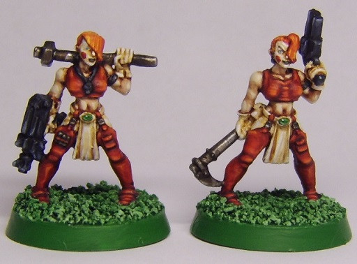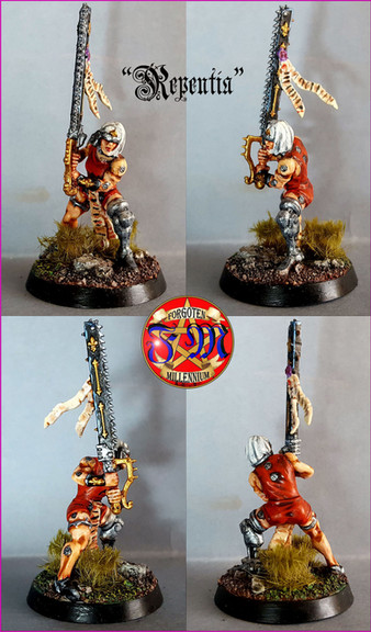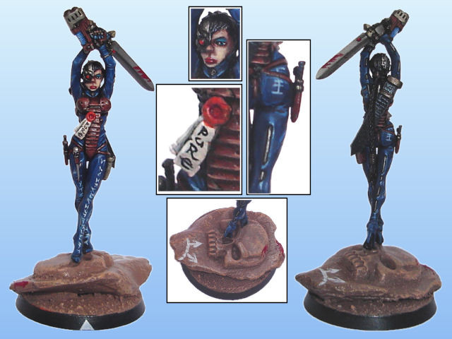Scratch built in green-stuff and Pro-Create at 32mm scale (she is roughly 34mm to the top of her head).