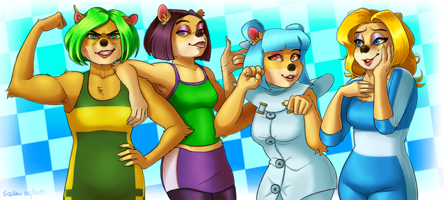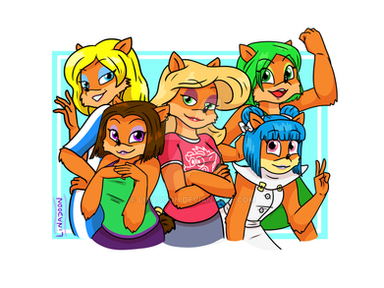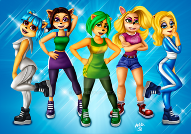 I had to draw the girls. I'm loving CTR: Nitro Fueled and I love playing as all of these gals. I originally wanted to add in Coco, but I decided not to. Anyways I hope you guys like this picture, I spent a LOT of time on it. And effort. Holy shit. I have a headache...btw which girl is your favorite? Tawna is queen of course but I also love playing as Ami, and Megumi is a cinnamon roll. And I love how British Liz is and how sort of punk she is.Crash Bandicoot belongs to Activision.