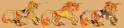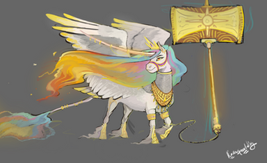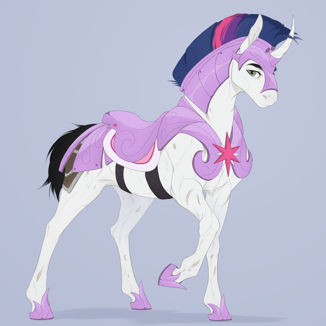 hhhhheeeeeres my version of Shining Armor!!! the top's his Official Captain/Emperor armor that he wears e'rey day around the empire. if he actually was called to battle he would have an extra saddle like metal piece that covers his back and haunches and goes over the blue piece and the fur.