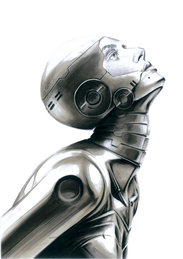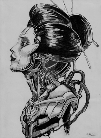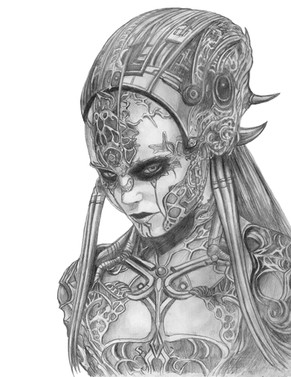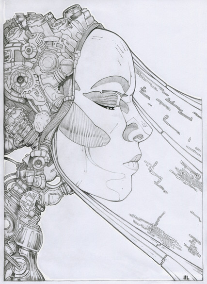 This one I worked on for quite a while, shading and drawing portions of this every now and then for many months. I'll declare it complete now. Depicted is a sort of an advanced gynoid- a concept which I find nearly completely useless, but quite aestethic. It's nice to draw something like this from time to time.