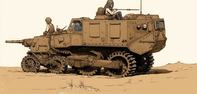 Oh this steel colossus has succeeded well. It fits so well with the apocalyptic desert theme that it could also appear in films like Max Payne. The colors are also well chosen, it has a rust flair that also emphasizes the dirt. The whole details like the turret are drawn very detailed and has the effect that the car generally appears larger and more important. The characters are also very naturally involved in the environment and are unaffected by all of this. good work.
