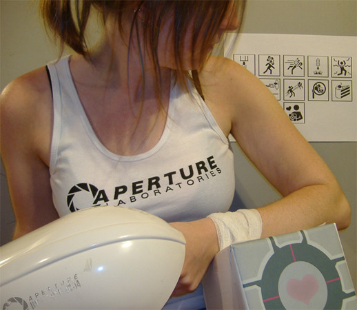 I want me a Companion Cube plushie, it would make a good pillow. Great CosPlay, by the way!