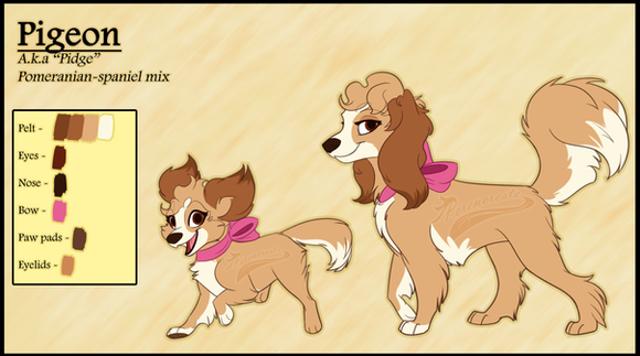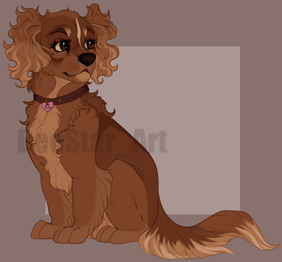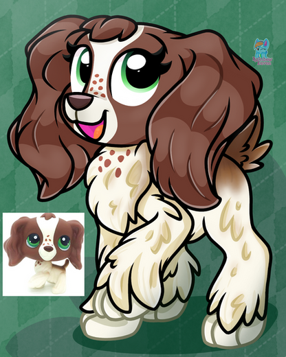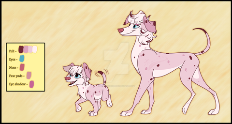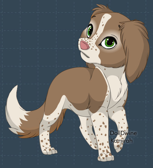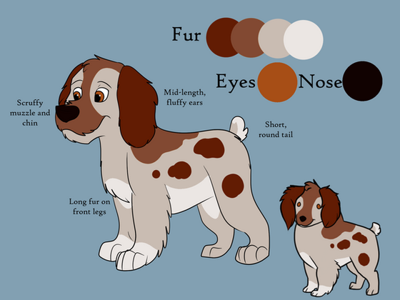 I was asked for a patchy, brown-piebald design. Looking at springer spaniels, I saw some had hazel eye colors, which I eventually switched into green. The green eyes somehow made me think of clovers and I decided to go with a 'clover' theme here xD. Maybe she's sort of a lucky charm [four-leaf clover] to the people who adopted her. It was a cute concept and client approved, so I went with it ^^