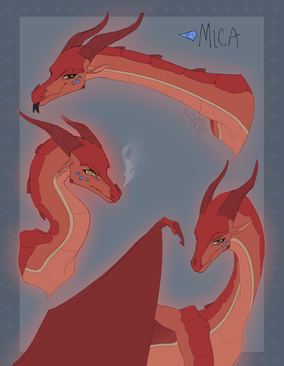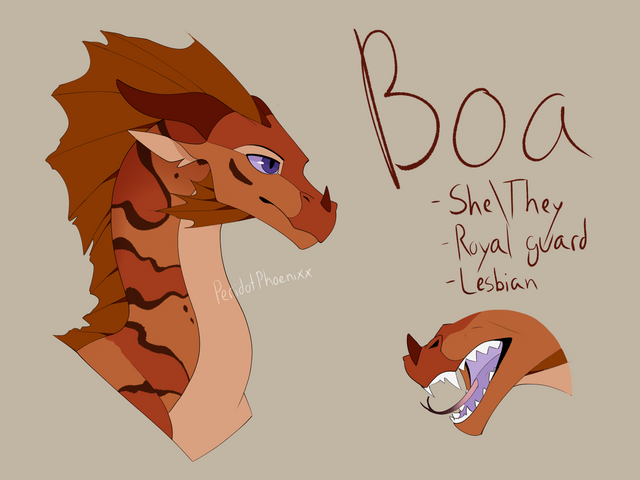 Updated reference for my Rain/Sand oc BoaBoa is a she/they lesbian and the right hand claw to Prince Mirage . She cannot change color or spit venom like most rainwings, rather she has acidic fire that eats away at the flesh. Boa also has larger fangs and high tolerance for both heat and humidity. She also has a half sister (Sand/Silk) who she harbors a very bad relationship with.