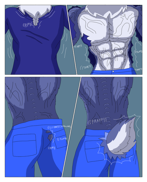 Here is the Transformation into my Werewolf Form, a art by me.The Fourth of my body is strain and rip up my singlet top while it's a bit too much for my abs exposed which it tears to pieces.