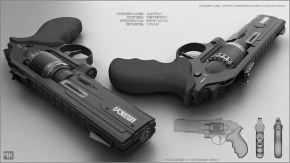 Revolvers really are one of my favourite types of gun. They're compact, cool looking and they are most certainly consistent and reliable. I see what you were going for here with a more sleek and mechanical sci-fi look and it presents itself well. as usual, it doesn't really need any annotations because looking closely you can see how it fires. I really like how it looks as if the projectile would exit through the centre as it gives it a sense of uniqueness compared to regular revolvers like the Mp412-rex or the Ruger Vaquero. It doesn't really need any fancy colours or large barrels to look sci-fi and this captures that concept perfectly.