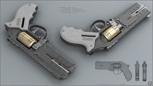 Concept of futuristic revolver.Design is based on usual profile but there is power pack instead of drum. Hammer is replaced by pin. When you pull that pin you release mechanism. Body is open by turning front part down and power pack can be ejected.Β Β