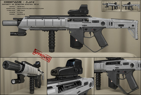 Technically, this is a well done piece. The model is clean, and the ortho views in the corner help to wrap your head around the proportions. It truely looks like it could be an ad in some modern version of Soldier of Fortune. The warning label is an awesome touch.