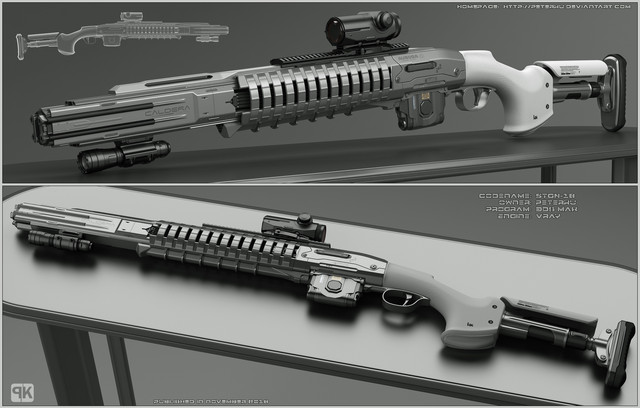 More people suggested me to make laser gun so here it is. Concept of laser rifle. Objective was to make shine solid metal piece from the sci-fi future. It works with light beam not with projectiles and therefore there is no recoil. Instead of stock I use its place as handle.I uploaded more pictures of this project. There are pictures from various angles and sizes + wireframes of model in my gallery.