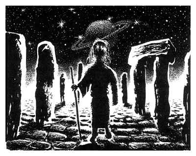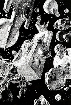 Oh, I love this style of illustration. Spots of black and criss-cross effect on the monolith itself. I have no idea if it has a name, but it looks really "organic" for lack of a better word. Reminds me of some of my childhood favorite illustrators.