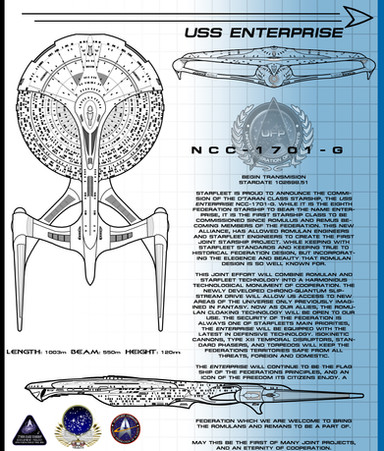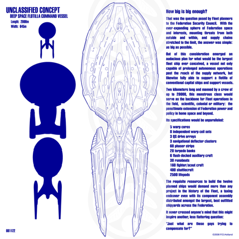 Makes my plans for the "Century Class" - 2.5 times the volume of a Galaxy class, at an overall length of just shy of 1,000m - look positively puny! I like the idea of a ship that's almost totally self-contained and self-sufficient, more like a mobile starbase than a conventional starship. As close as Starfleet ever gets to an Culture GSV