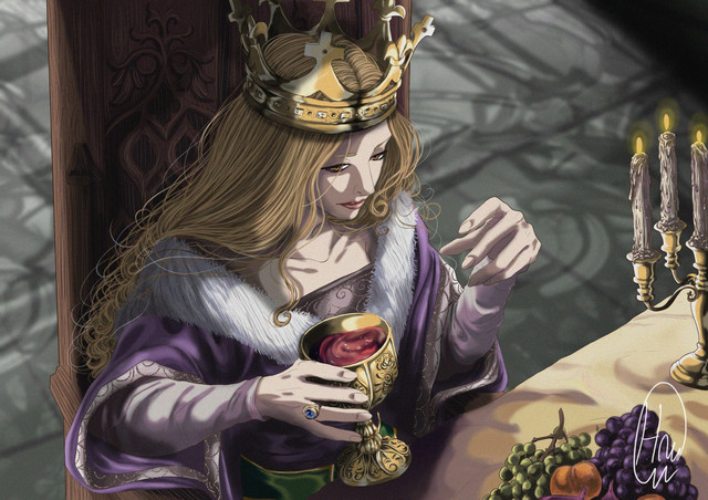 Y el ornamento plateado del frente son raíces expuestas, el símbolo del destierro. Mientras que el mismo atardecer de la escena es una forma de decir que su vida y amor está entrando en la oscuridad e incertidumbre de lo desconocido.